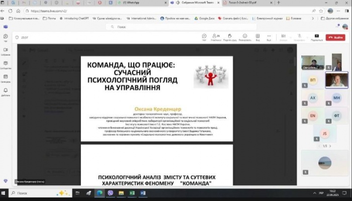 22 вересня, за ініціативою голови осередку УАОППП, к.пед.н., доцента, доцента кафедри філософії та соціально-гуманітарних наук - Черушевої Г. Б., в рамках вивчення курсу «Психологія управління» відбулася гостьова зустріч здобувачів вищої освіти другого (магістерського) рівня освітніх програм «Менеджмент зовнішньоекономічної діяльності», «Прикладна статистика та бізнес-аналітика», «Облік, аудит та опадаткування», «Фінанси, банківська справа та страхування» з д. психол. н., професором, завідувачем відділу соціальної психології особистості Інституту соціальної та політичної психології НАПН України, діючим членом Виконавчої Дирекції Української Асоціації організаційних психологів та психологів праці (УАОППП) - Оксаною Креденцер.
