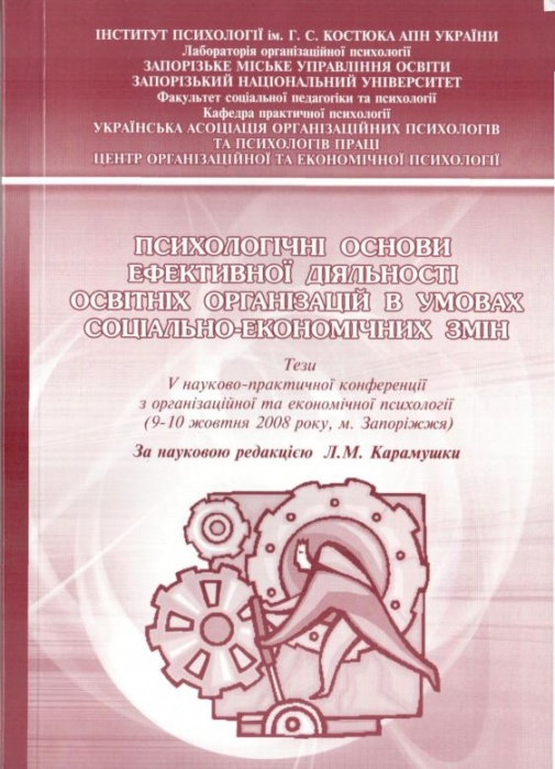 Тези V наук.-практ. конф. з організаційної та економічної психології (9–10 жовтня 2008 р., м. Запоріжжя) / За наук. ред. Л. М. Карамушки. – К. : Наук. світ, 2008. – 123 c. Збірка тез є першою в Україні збіркою наукових матеріалів із психологічних основ ефективної діяльності освітніх організацій в умовах соціально-економічних змін. Матеріали збірки відображають найбільш актуальні науково-прикладні проблеми, які нині розробляються в цій галузі українськими науковцями та практиками.