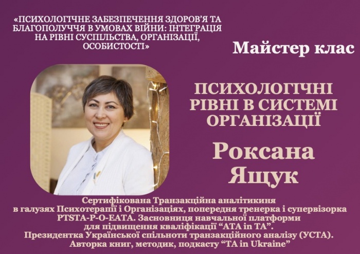 «ПСИХОЛОГІЧНЕ ЗАБЕЗПЕЧЕННЯ ЗДОРОВ’Я ТА БЛАГОПОЛУЧЧЯ В УМОВАХ ВІЙНИ: ІНТЕГРАЦІЯ НА РІВНІ СУСПІЛЬСТВА, ОРГАНІЗАЦІЇ, ОСОБИСТОСТІ», яка відбудеться
