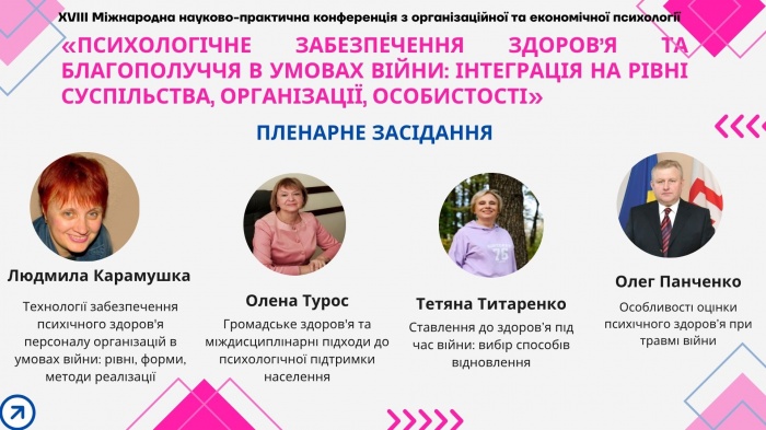 ХVІІІ Міжнародна науково-практична конференція з організаційної та економічної психології «ПСИХОЛОГІЧНЕ ЗАБЕЗПЕЧЕННЯ ЗДОРОВ’Я ТА БЛАГОПОЛУЧЧЯ В УМОВАХ ВІЙНИ: ІНТЕГРАЦІЯ НА РІВНІ СУСПІЛЬСТВА, ОРГАНІЗАЦІЇ, ОСОБИСТОСТІ