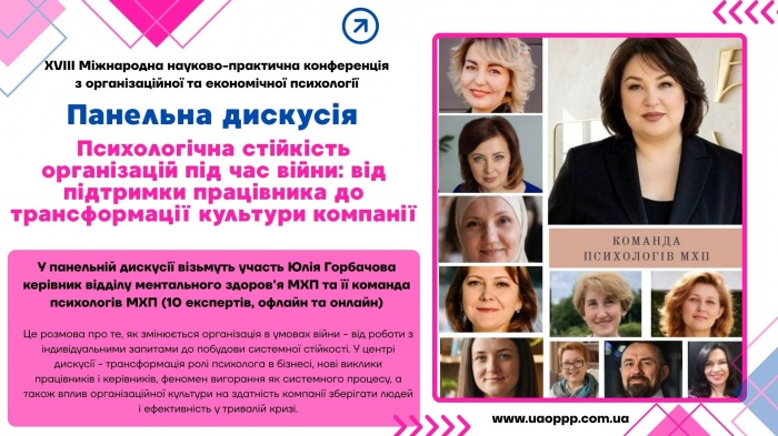 Українська Асоціація організаційних психологів та психологів праці, лабораторія організаційної та соціальної психології Інституту психології імені Г.С. Костюка НАПН України, відділ соціальної психології особистості Інституту соціальної та політичної психології та ДУ «Інститут громадського здоров’я ім. О. М. Марзєєва НАМН України» проводять ХVІІІ Міжнародну науково-практичну конференцію з організаційної та економічної психології